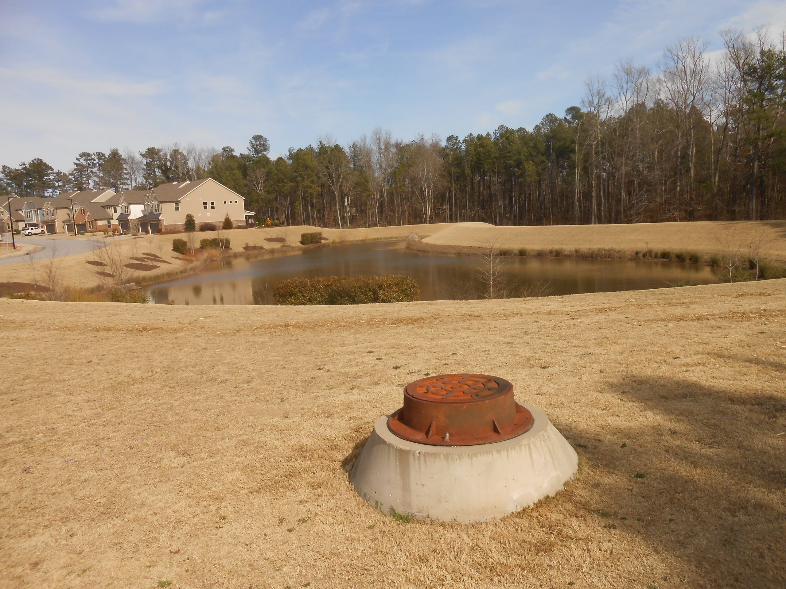 DSCN6993 March 9, 2021 2560 × 1920 DSCN6993 The yards at the Meadows at Southpoint drain through storm pipes into this retention pond required by Durham’s Uniform Development Ordinance