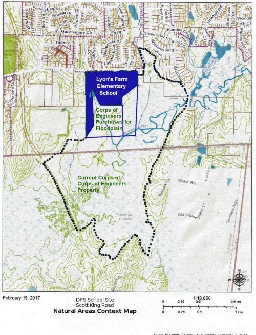 Continuous portion of the Northeast Creek bottom lands natural heritage area between Grandale Road and the American Tobacco Trail